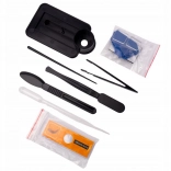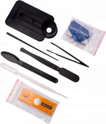 - Setul include: unelte pentru prepararea mostrelor, lamele de bază, sticluțe de depozitare mostre, cârpă de curățat și suport pentru telefon.