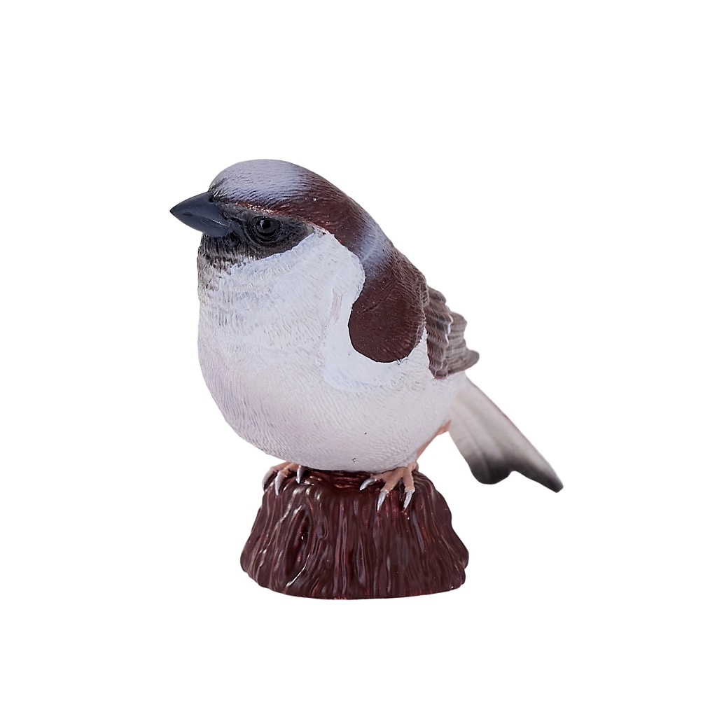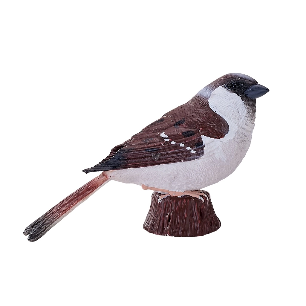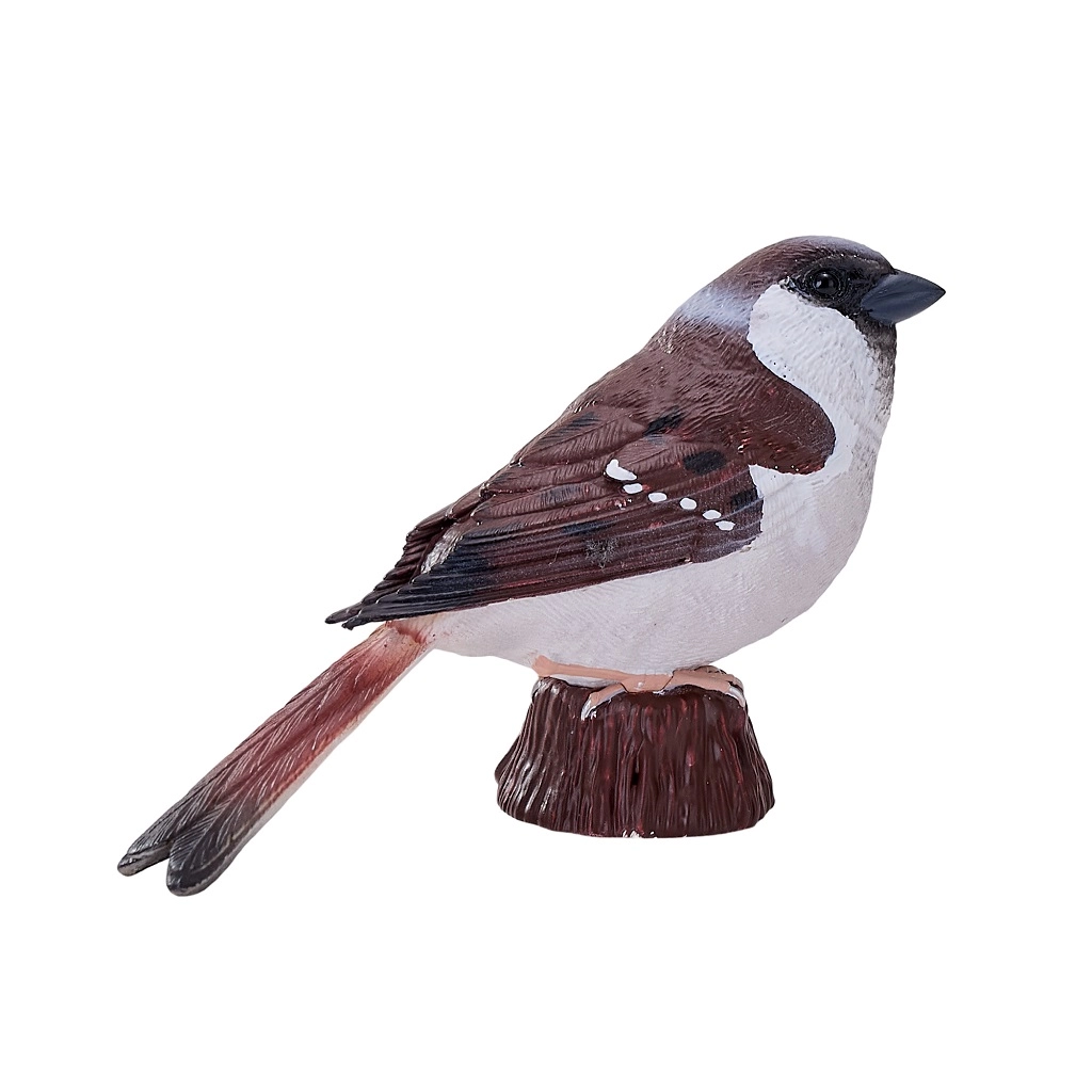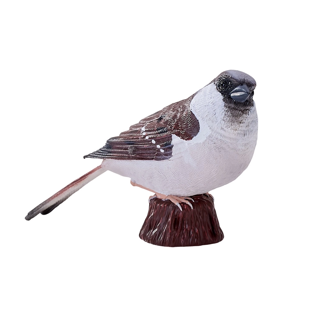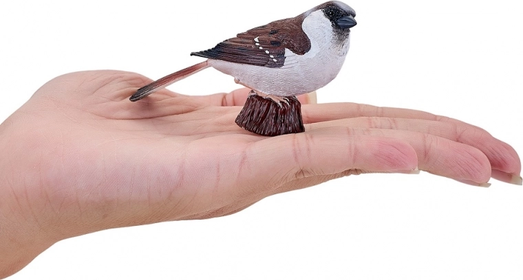 Modelarea atentă și pictura manuală evidențiază trăsăturile realiste ale vrabiei – de la textura penajului până la coloritul autentic.