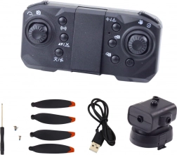 - Dronă D6 Pro, telecomandă, modul de cameră suplimentar, acumulator, cablu USB, 4 elice de rezervă, 4 apărători pentru elice, șurubelniță, husă de transport
