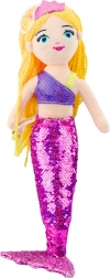 Sirena de pluș are părul lung, ondulat, galben și o coroană roz. Topul mov strălucitor completează o figură estetică și de basm, ideală nu doar ca jucărie, ci și ca decorație pentru camera copiilor.