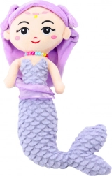 Sirena are fața brodată elegant și accente subtile de auriu și roz pe frunte, cu ochi zâmbitori. Părul de culoare mov deschis este împodobit cu o bentiță din material cu fundițe pe laterale, iar în jurul gâtului poartă un colier colorat din mărgele. Întregul design emană o delicatețe și un aspect de basm.