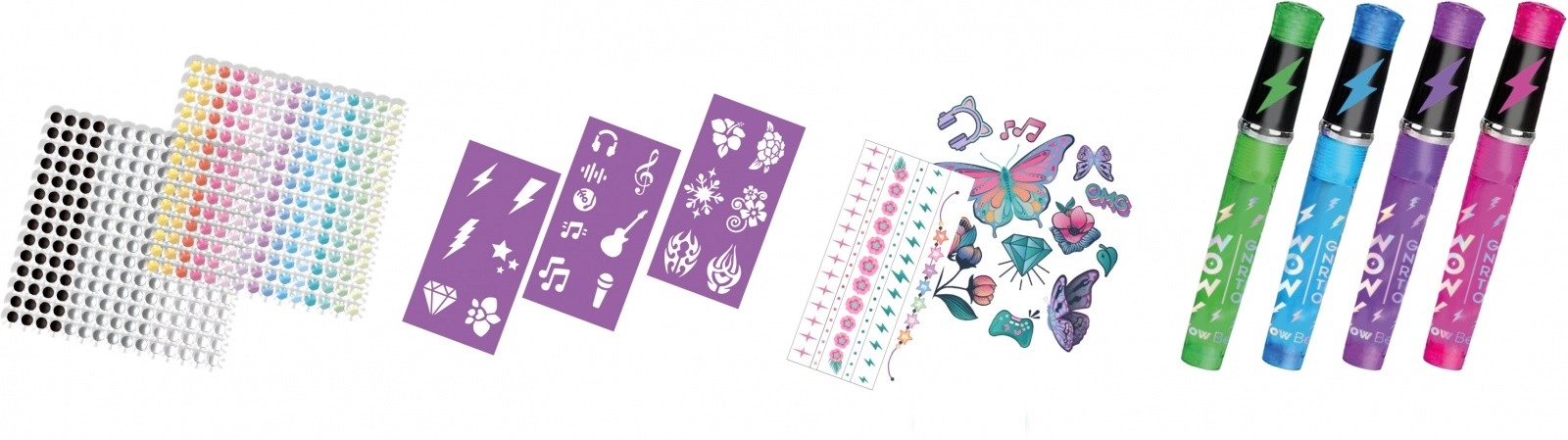 - Pixuri sclipitoare, șabloane, pietre decorative, tatuaje temporare