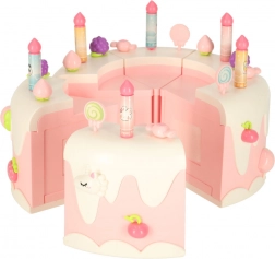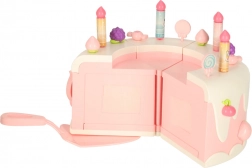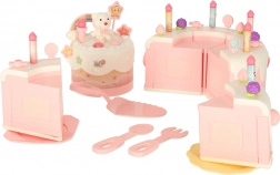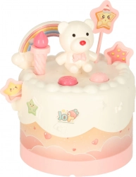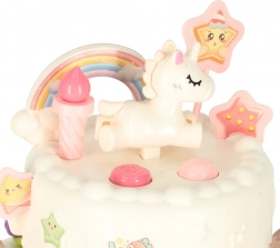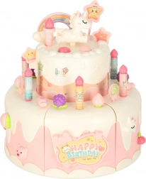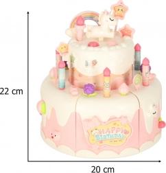 Tortul aniversar cu două etaje realizat din plastic de calitate este o jucărie ideală pentru copiii peste 3 ani. Dezvoltă creativitatea și motricitatea fină datorită elementelor interactive, precum rotirea și efectele muzicale. Setul include figurine drăguțe cu ursuleț și inorog, șase lumânări și alte accesorii.