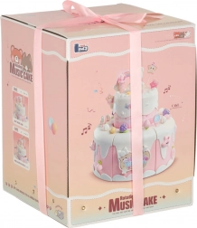 Tortul este livrat decorat cu o panglică roz, într-un ambalaj transparent cu fereastră. Alimentat de trei baterii tip AA (nu sunt incluse în pachet).