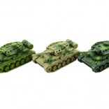 Ambalajul în cutie conține 10 bucăți, iar tancurile sunt disponibile în 3 culori atrăgătoare, astfel încât copiii își pot crea propria unitate și își pot dezvolta scenariile de joc. Dimensiunile compacte 11 × 5 × 4 cm se potrivesc perfect în mâna copilului.