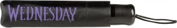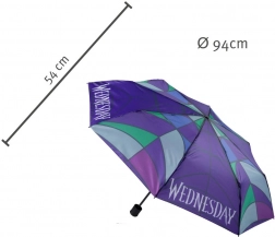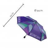Umbrelă pliabilă stilată cu un motiv elegant și întunecat Wednesday, ideală pentru rucsac și geantă. Design compact permite transportul ușor și protecție fiabilă împotriva ploii.