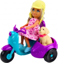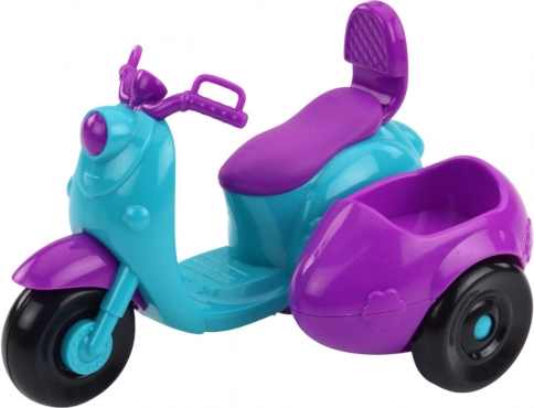 Păpușa călătorește pe un scuter cu trei roți, de un turcoaz-violet intens. Remorca de lângă scuter ascunde un mic cățel cu zgardă roșie – un companion loial pentru fiecare călătorie. Setul este fabricat din plastic durabil, sigur, ideal pentru jocul zilnic.