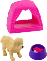 Setul include un mic cățeluș - un companion loial al păpușii, care are nevoie de îngrijire, hrană și un loc de odihnă. Special pentru el este pregătit un cort roz care servește drept căsuță - ideal pentru odihnă, joc sau somn. Setul include, de asemenea, un bol cu os și o gustare pentru jocurile realiste de scenă.