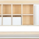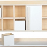 Include trei sertare, un compartiment lateral și un raft posterior cu uși glisante pentru suficient spațiu de depozitare.