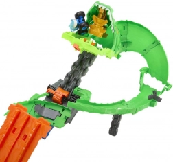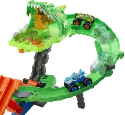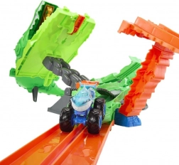 Pornește duelul plin de adrenalină cu setul tematic „Rechini vs. Dinozauri: Cursa dragonului”. Plasează ambele camioane în lansatorul dublu și trimite-le pe piste paralele direct spre fălcile dragonului cibernetic. Totul este decis de macazul în formă de fierăstrău, care stabilește aleatoriu dacă vehiculele se opresc, unul cade de pe pistă sau ambele străbat și doboară dragonul la pământ.