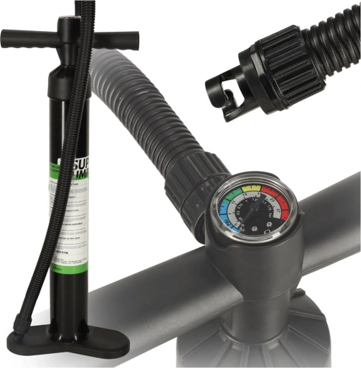 Pompă manuală de înaltă presiune pentru SUP este un instrument indispensabil pentru umflarea rapidă și eficientă nu doar a plăcilor SUP, ci și a altor produse gonflabile. Datorită manometrului integrat puteți controla precis presiunea pentru o umflare optimă a echipamentului. Pompa este echipată cu picioare stabile, care asigură stabilitatea în timpul pomparii, și un mâner 'T', care oferă o prindere confortabilă și sigură, esențială pentru un lucru comod. Cu această pompă, vă veți pregăti rapid placa pentru apă și veți savura fiecare aventură!
