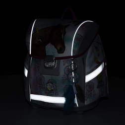 Rucsacul școlar din gama Premium Light cu un elegant motiv de cal oferă mai mult decât doar un aspect frumos. Este fabricat dintr-un material ușor, cântărind astfel mai puțin de 900 g. Rucsacul este echipat cu spate respirabil confortabil și curele largi căptușite care distribuie uniform greutatea pe umerii copilului. Pentru un confort și mai mare sunt incluse curele de talie și de piept.