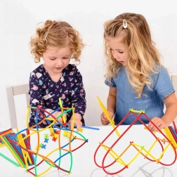 Acest set creativ combină tuburi ușoare și flexibile cu mai multe tipuri de conectori, datorită cărora puteți construi cu ușurință modele simple sau avansate. Piesele luminează în întuneric, astfel încât fiecare construcție se transformă, după stingerea luminii, într-un spectaculos show luminos. Sistemul rapid de fixare prin click susține autonomia copiilor și învățarea fluidă prin joc.