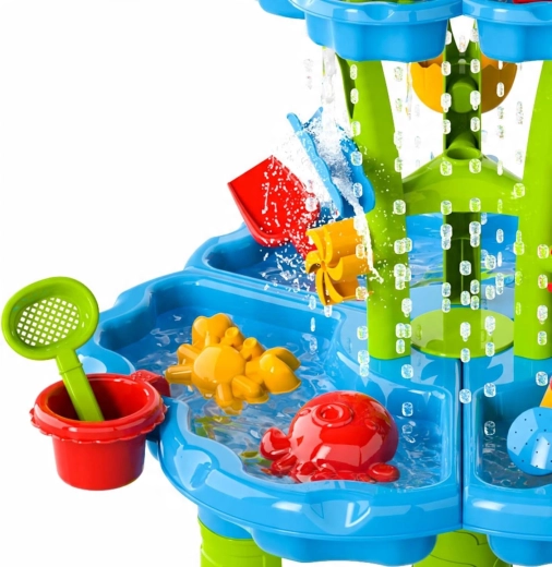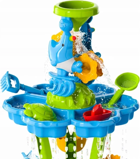 Creați-le copiilor propriul mini aquapark. Măsuța oferă trei compartimente independente – unul îl puteți umple cu apă, al doilea cu nisip, iar al treilea îl puteți lăsa pentru amestecare și experimente. Apa curge prin jgheaburi în cascadă, pune în mișcare roțile și trece prin porți, astfel încât copiii observă clar relațiile de cauzalitate și își dezvoltă motricitatea fină.