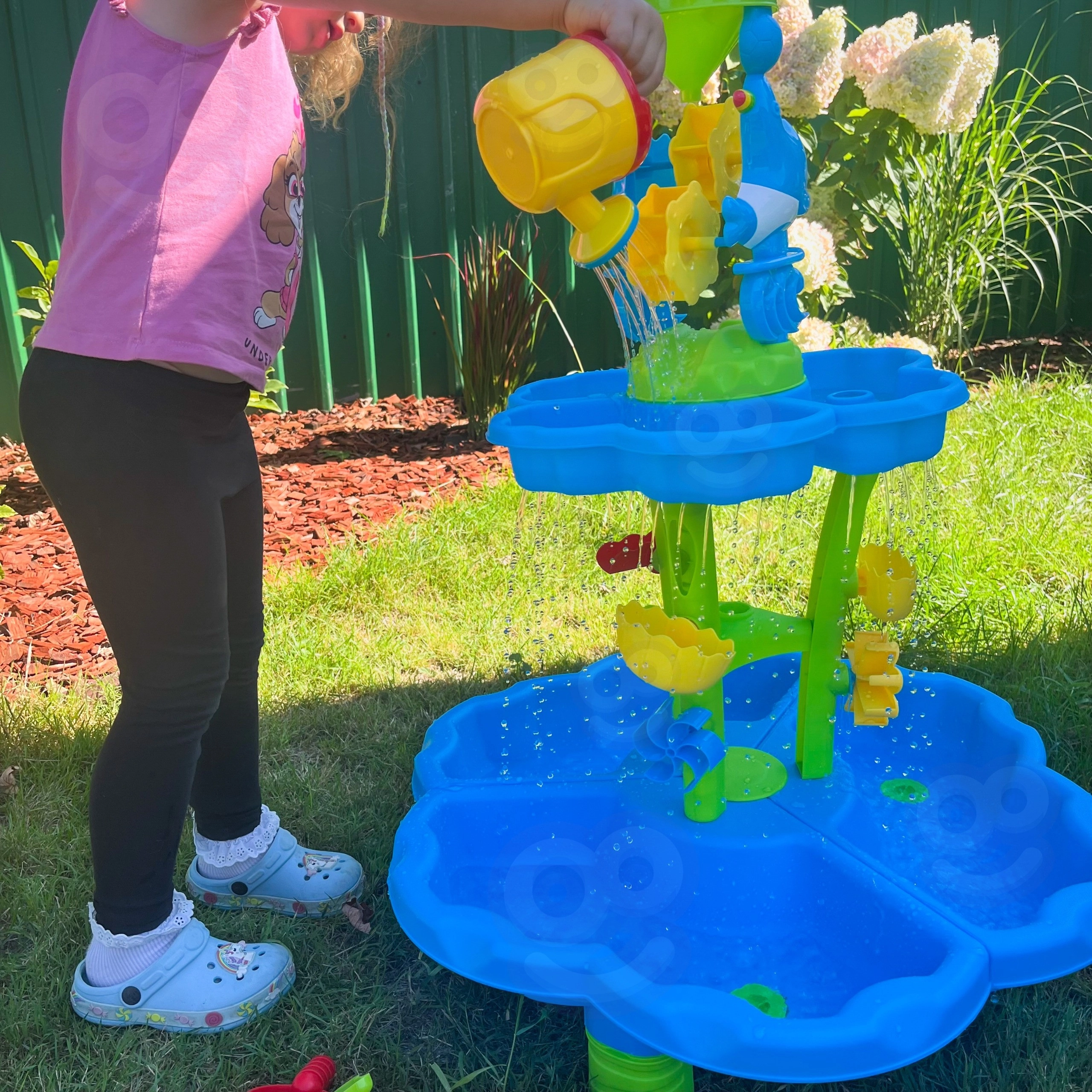Apa curge pe mai multe niveluri, pune în mișcare roțile și creează mini cascade care îi fascinează pe copii și îi învață relațiile de cauzalitate.