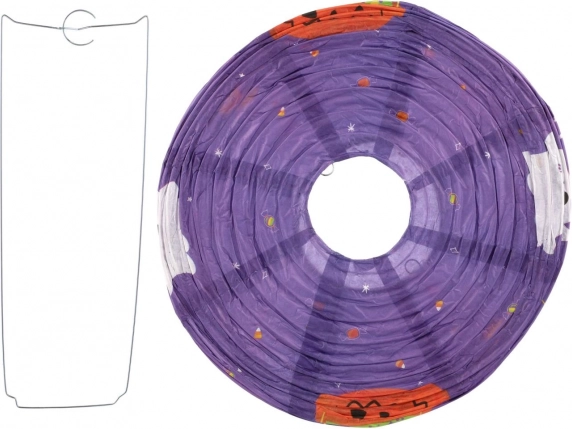 Acest lampion decorativ este ideal pentru petreceri de Halloween, decorul camerei copiilor, grădini sau vitrine. Forma rotundă, tonurile intense de portocaliu și mov și motivele specifice Halloween-ului asigură un efect imediat. Datorită cârligului metalic și cadrului interior se asamblează și se agață cu ușurință.