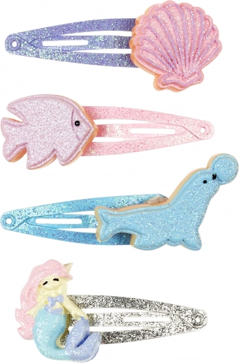Set de patru agrafe strălucitoare pentru păr cu motive de basm, sirenă, focă, pește și scoică, care adaugă coafurii o notă magică.