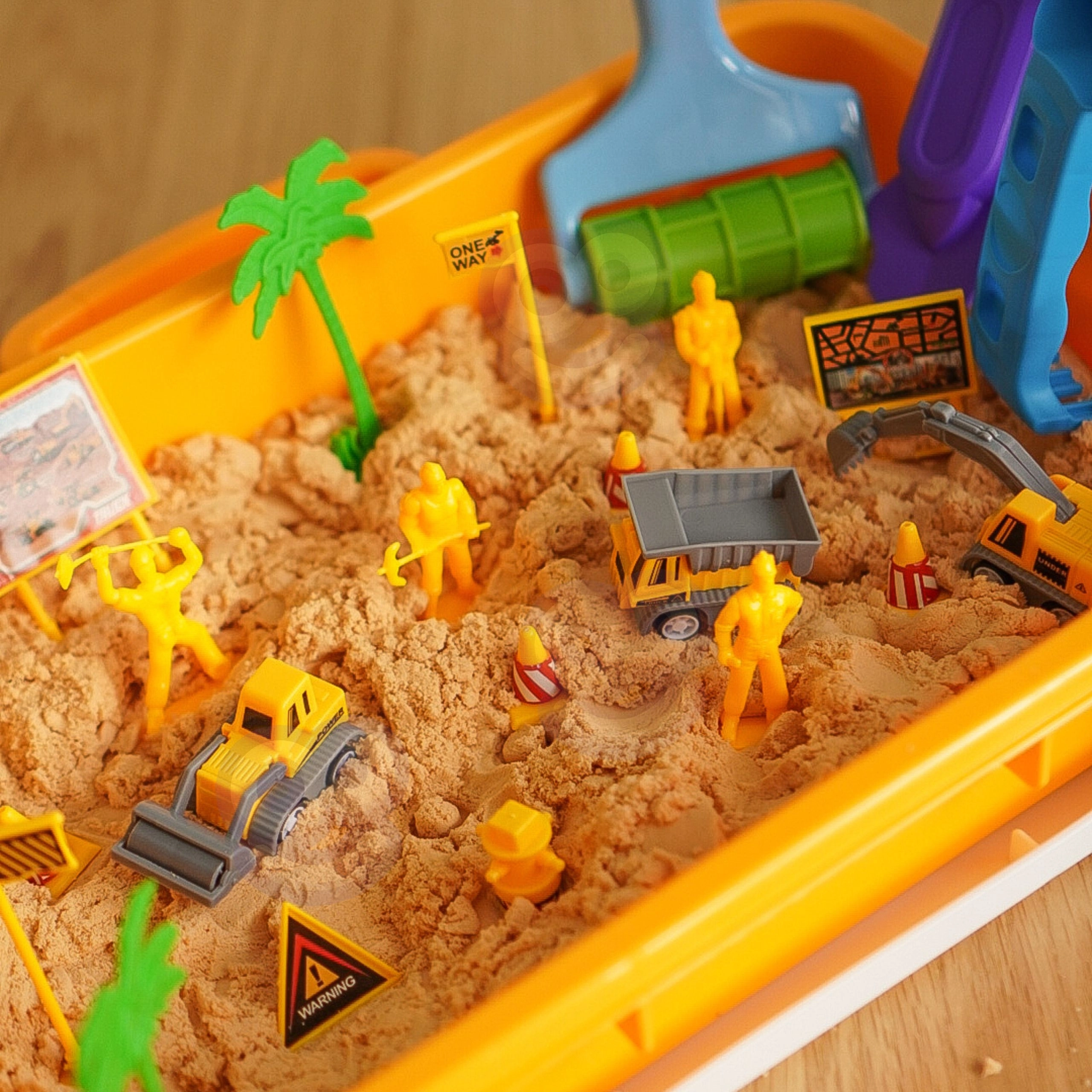 - Conținutul pachetului: aprox. 1500 g de nisip kinetic, cutie/tavă portabilă, vehicule de construcții, figurine, semne rutiere, conuri, palmieri, unelte și forme, autocolante.