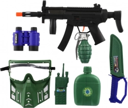 Pregătiți-vă pentru aventură cu acest set militar, care include o pușcă mitralieră din plastic și accesorii tematice, ideale pentru dezvoltarea imaginației și jocului activ.