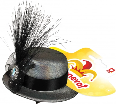 - este împodobită cu panglică neagră, pene și tul pentru un aspect sofisticat