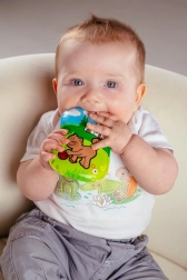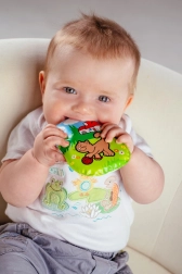 Pernița este realizată din materiale sigure fără ftalați și este certificată pentru copii din primele zile de viață. Este disponibilă cu mai multe modele drăguțe cu animăluțe, care susțin stimularea vizuală și primele cunoașteri.