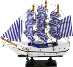 ucură-te de frumusețea modelului de navă cu pânze finisat manual, inspirat de corăbiile comerciale din secolele trecute. Cu un corp alb având o bandă neagră și un interior albastru proeminent, acest model capturează esența porturilor maritime și adaugă un aer ușor decorativ spațiului.