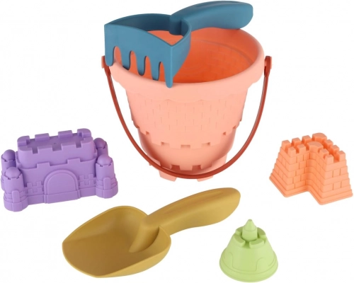 Găleată, lopățică, greblă și trei forme pentru construit și modelat creativ nisipul într-un singur set ușor.