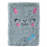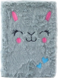 Caietul plușat în linii cu motiv brodat al unui iepuraș gri este un produs drăguț și util care atrage imediat. Coperta fină, din pluș, de culoare gri estompată este decorată cu broderie de față de iepuraș, cu urechi și obraji roz și două inimioare albastre, conferind produsului farmec și bucurie copilărească.