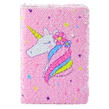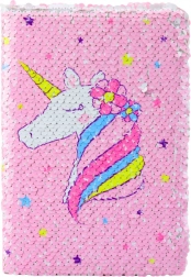 Coperta caietului este acoperită cu paiete mobile și strălucitoare care își schimbă culoarea de la roz la alb doar prin trecerea mâinii peste ele. Sub acest strat fascinant, veți găsi un motiv magic de unicorn decorat cu flori, care va încânta orice iubitor de creaturi magice.