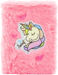 Carnet de pluș cu un unicorn drăguț pe un fundal holografic este un produs deosebit, care impresionează prin aspectul și practicitatea sa.