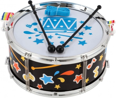 Pornește propriul spectacol muzical! Tobă colorată din plastic, cu bretea practică și bețișoare, ideală pentru micii pasionați de muzică. Copiii pot bate la tobă oriunde și oricând – jocul dezvoltă în mod natural ritmul, motricitatea fină și creativitatea.