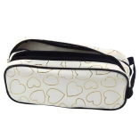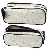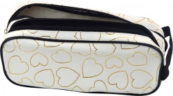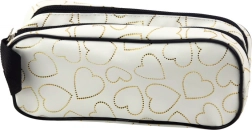 Un penar cu două compartimente stilat, de culoare albă, cu inimioare aurii, ideal pentru fiecare elev care caută o combinație între design modern și organizație practică a materialelor școlare.