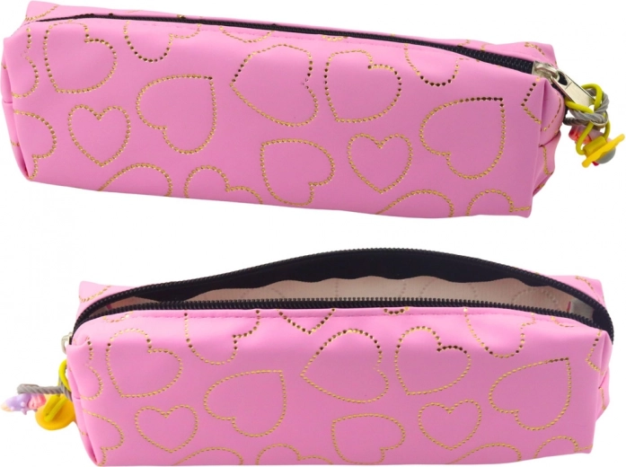 Penarul roz cu inimi aurii este un accesoriu stilat și practic pentru orice student sau profesionist. Acest penar se distinge prin dimensiunea sa compactă și construcția ușoară, făcându-l o alegere excelentă pentru păstrarea celor mai importante rechizite de scris, cum ar fi pixuri, creioane, markere sau evidențiere. Dimensiunile sale permit un transport ușor într-un rucsac sau geantă de lucru.