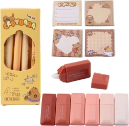 Setul include un set bogat de accesorii cu tematica capibara, cum ar fi: 4 pixuri cu cerneala neagra, 6 gume mouse pentru corecturi, 4 seturi de post-it-uri decorative, o capibara de plu19 cu bro1ba, un breloc cu capibara, 2 clipuri cu capibara 19i 5 autocolante amuzante. Acest produs este un cadou ideal pentru elevi, iubitorii de animale sau oricine iubeste accesoriile unice pentru studiu.