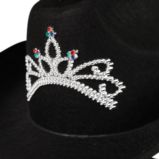 Pălăria de cowboy neagră este decorată cu o coroană argintie, ideală pentru orice grupă de vârstă. Un accesoriu elegant care te va face inconfundabilă.