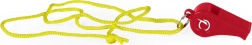 Fluier din plastic roșu atașat la un șnur galben, ideal pentru semnalizare sau activități sportive.