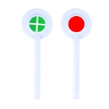 Două palete din plastic cu mânere albe lungi, una cu cerc verde și cealaltă cu cerc roșu. Excelent pentru joaca și semnalizare în timpul antrenamentului.
