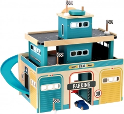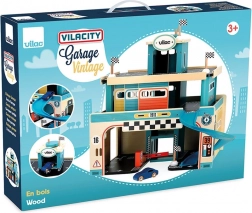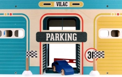 Garajul din lemn în stil vintage din seria Vilacity oferă copiilor posibilități nelimitate de joacă. Datorită ușilor glisante, ascensorului pentru mașinuțe și pistei în spirală, copiii pot: