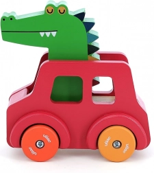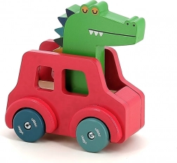 Mașinuța din lemn de culoare roșie, cu roți colorate, ascunde sub crocodil un mic claxon care se activează prin apăsarea pe capul său. Acest mecanism simplu stimulează curiozitatea copiilor mici, oferind feedback direct și interacțiune. Datorită formei ergonomice, jucăria este ideală pentru copiii mici și ajută la dezvoltarea motoricii fine, coordonării mână-ochi, și susține creativitatea și imaginația.