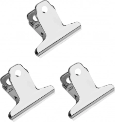 Vă prezentăm un set de trei cleme masive, fabricate din metal galvanizat, care oferă o rezistență ridicată la presiune. Aceste cleme au margini netede, mecanism flexibil și un orificiu ce permite agățarea, ceea ce le face un instrument practic pentru utilizarea zilnică.