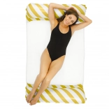 Design ergonomic: Îmbinarea a două perne gonflabile printr-o plasă de nailon flexibilă și respirabilă oferă o poziție semi-culcată, în care corpul este parțial submers în apă, permițând o răcire naturală și o bronzare confortabilă.