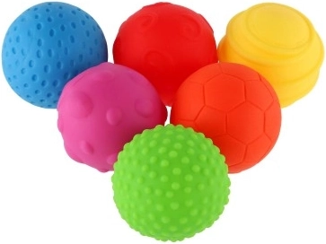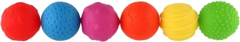 Set colorat de șase mingi moi cu texturi diferite pentru cei mai mici, care susține dezvoltarea motricității fine și grosiere, percepția senzorială și explorarea tactilă. Fiecare mingiuță are altă suprafață și culoare, la apăsare scârtâie și este sigură pentru sănătate. Excelent pentru stimularea mișcării și învățare distractivă.