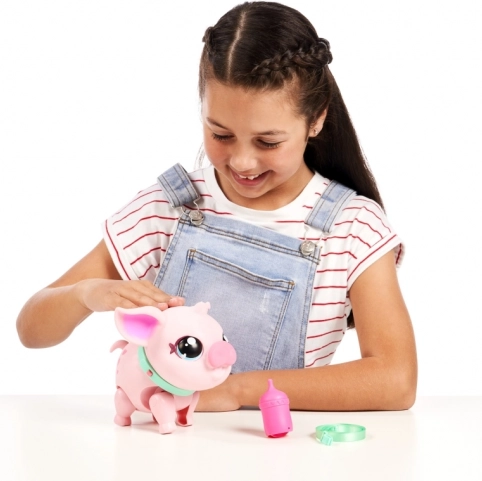 Descoperă animalul de companie fermecător care prinde viață în mâinile copiilor. Piggly este un purceluș roz, moale, cu ochi adorabili și colier, care reacționează la atingeri, mișcare și îngrijire. Cu ajutorul lesei îl poți lua ușor la plimbare, iar când îi este foame, îl hrănești cu biberonul.