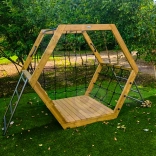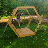 Acest mare teren de joacă de exterior, cu plan hexagonal, oferă stabilitate, siguranță și numeroase moduri de a consuma energia prin mișcare. Copiii se pot cățăra pe plasa din frânghie, pot traversa barele metalice tip scară și se pot agăța de barele de maimuță, consolidând întregul corp și îmbunătățind motricitatea.