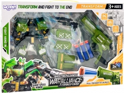 Intră în acțiune cu setul dinamic WOOPIE: un robot transformabil verde, care se schimbă în câteva clipe într-un vehicul de luptă, și un revolver din spumă cu săgeți pentru distracție în siguranță. Ideal pentru copii de la 3 ani, dezvoltă creativitatea, gândirea logică și motricitatea fină.
