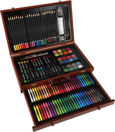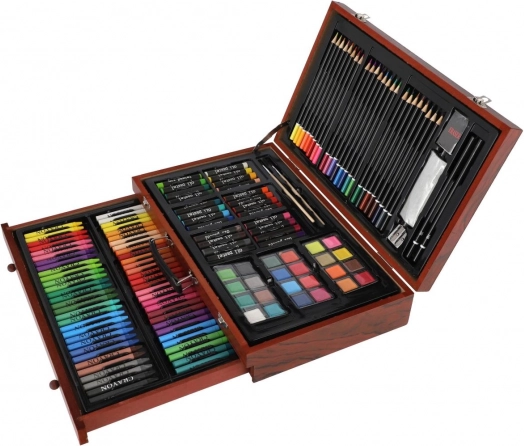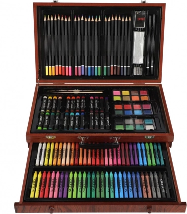 Set creativ universal pentru artiști mici și mari, conține în total 143 de piese pentru pictură, desen și creație. Totul este organizat clar într-o elegantă valiză din lemn cu închidere, cu dimensiuni de 38 × 25 × 8 cm. Ideal pentru creație acasă, proiecte școlare și călătorii. Potrivit pentru copii de la 14 ani.
