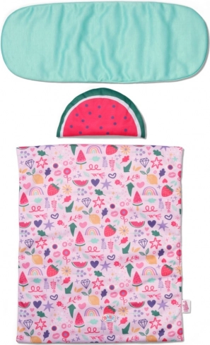 Perinuță în formă de pepene, saltea/tăblușă moale și păturică colorată cu motive de fructe asigură confortul păpușii la odihnă și adormire.
