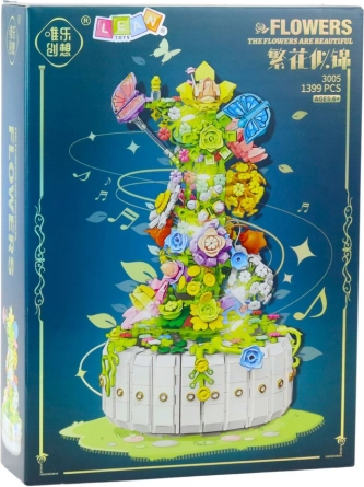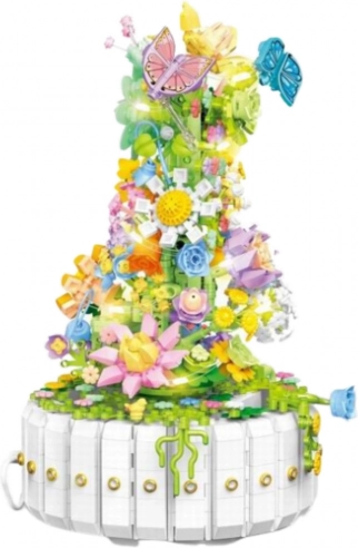 Un set de construcție excelent, care combină flora diversă cu un element decorativ elegant, oferind structuri detaliate de flori, frunze și fluturi. Compoziția asamblată se ridică spiral în sus, având un vârf magnific. Baza ansamblului este rotundă, albă, cu design decorativ.