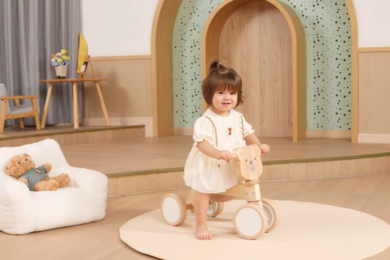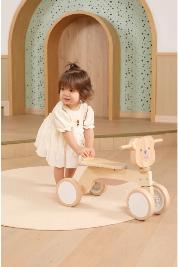 Drăgălașa trotinetă fără pedale din lemn, cu față de ursuleț, de la VIGA din seria PolarB, sprijină primele plimbări ale copiilor încă de la 12 luni. Baza stabilă cu patru roți, blocare sigură a direcției împotriva virajelor bruște și roți silențioase din EVA, prietenoase cu pardoseala, asigură o plimbare confortabilă și sigură atât în interior, cât și afară. Aspectul natural al lemnului și designul prietenos cu ursuleț vor fi îndrăgite pe loc de cei mici.