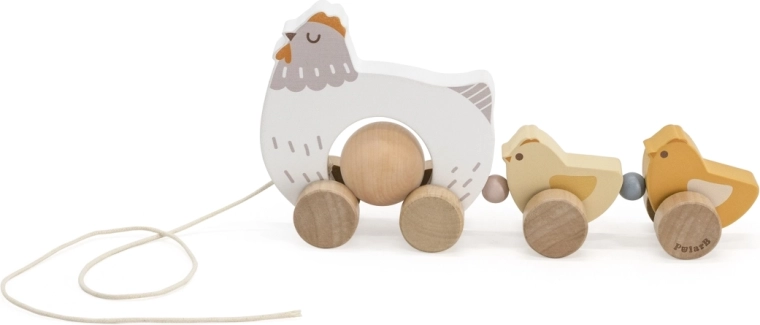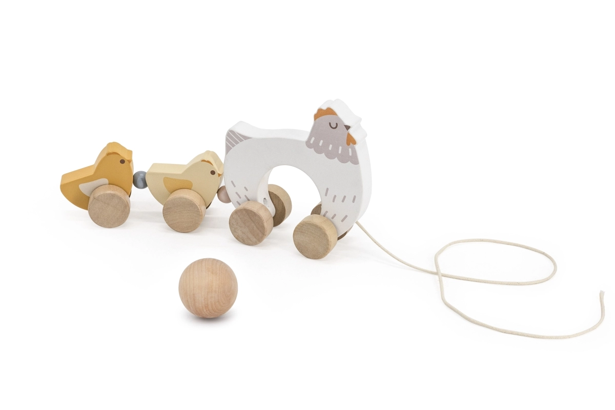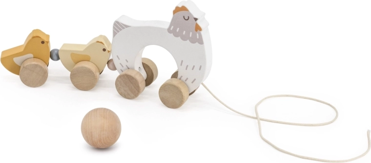 Jucăria este realizată din lemn de calitate cu margini rotunjite pentru utilizare în siguranță. Culorile naturale neutre și pastel se potrivesc de minune într-o cameră modernă pentru copii. Datorită rotițelor fluide și șnurului, găinușa cu puișori se trage ușor pe podea și devine o motivație pentru mers.